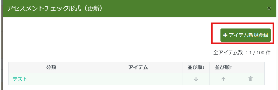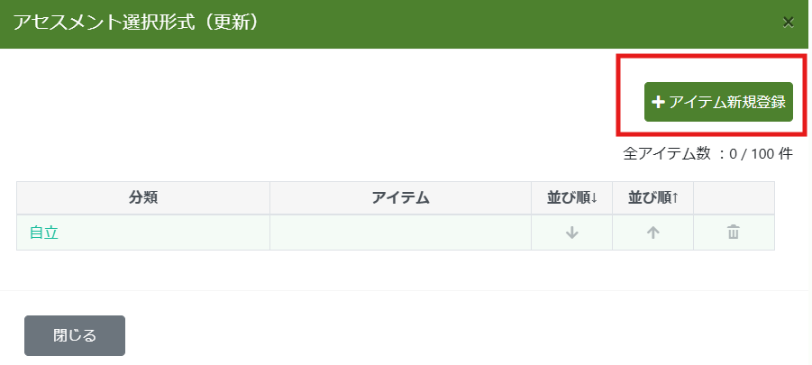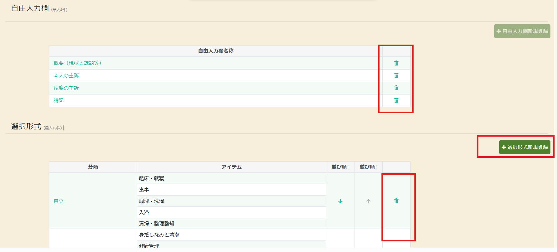 6. 不要な項目は【ゴミ箱マーク】をクリックし、項目を追加する場合は【+新規登録マーク】をクリックし各項目をカスタマイズする