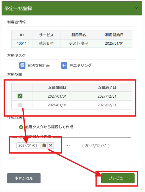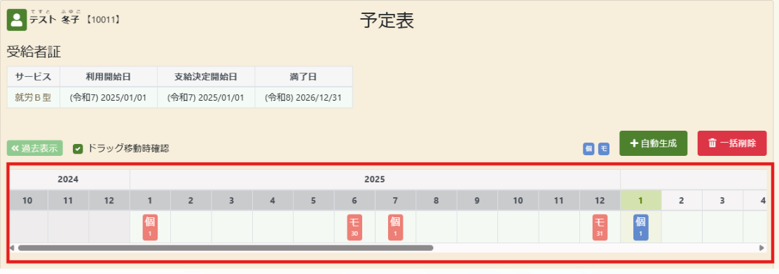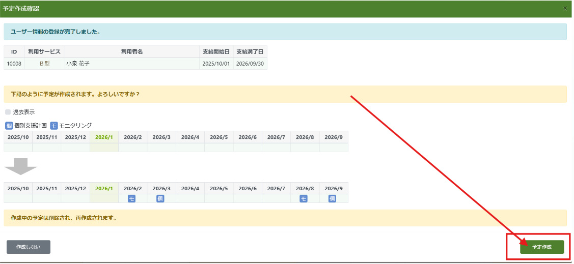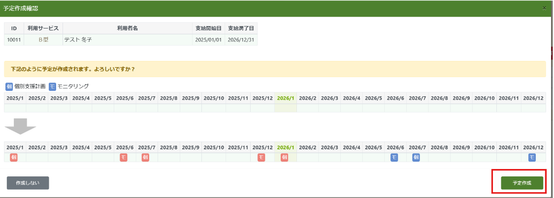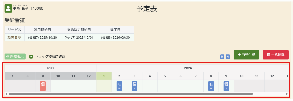 利用者詳細画面にて更新した支給期間を入力することで、更新後の個別支援計画やモニタリングの予定を自動生成することができます。