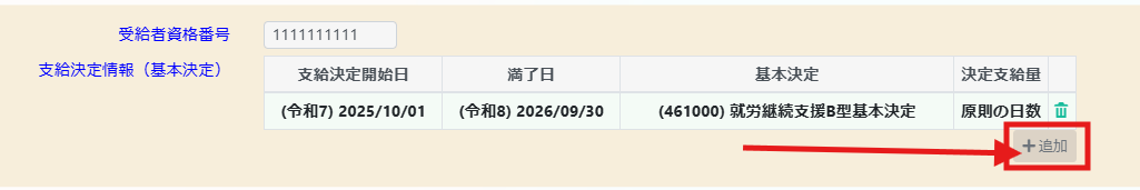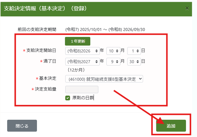 3. 更新後の支給決定情報を入力し、追加をクリック