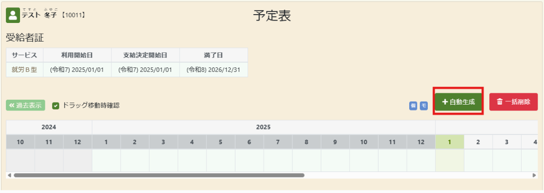① 予定表タブを開き、+自動生成ボタンをクリック