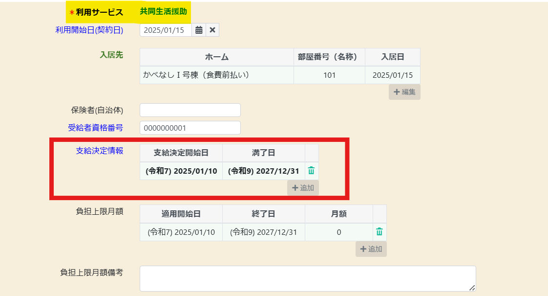 ※共同生活援助の場合は、基本1に支給決定情報(基本検定)の項目がございます。