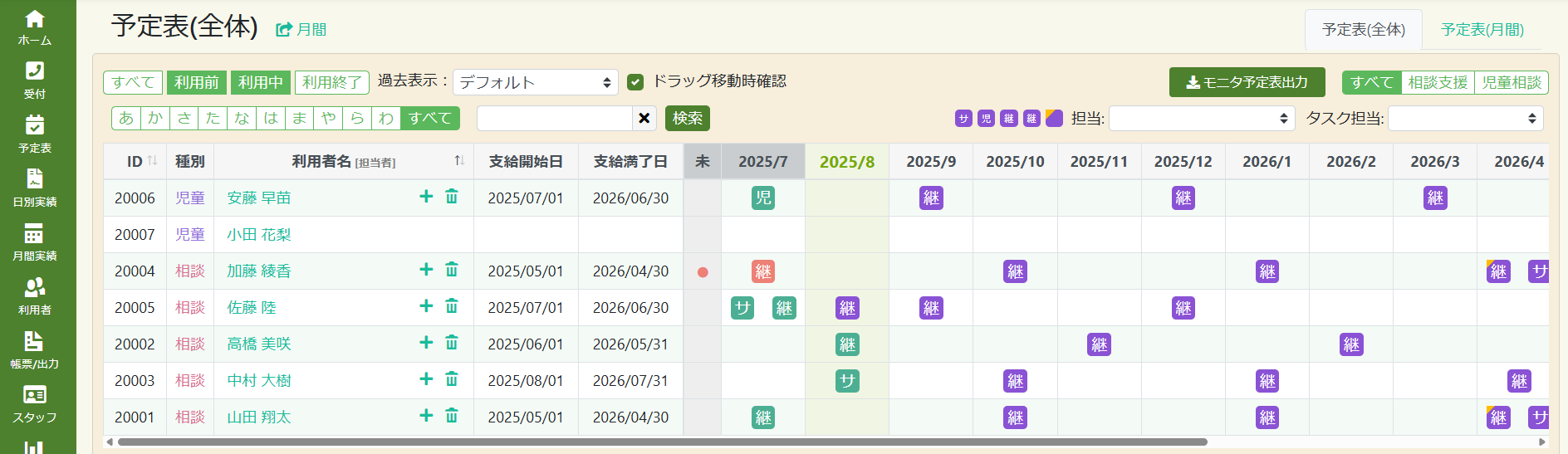 メインメニューの【予定表】では、計画とモニタリングの予定を一括で管理ができます。