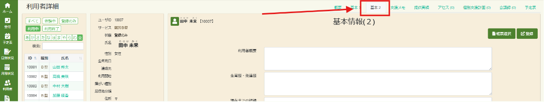 利用者詳細の基本2タブでは、その他障がい情報等を登録できます。