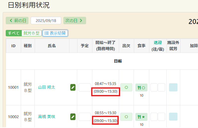 ▼日別利用状況の開始~終了時間の()内に登録した勤務時間が表示されます