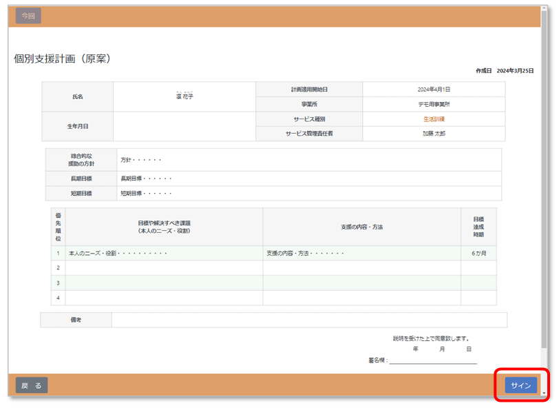 作成した個別支援計画が表示されます。利用者に内容を確認してもらったら、右下の「サイン」ボタンをタッチします。