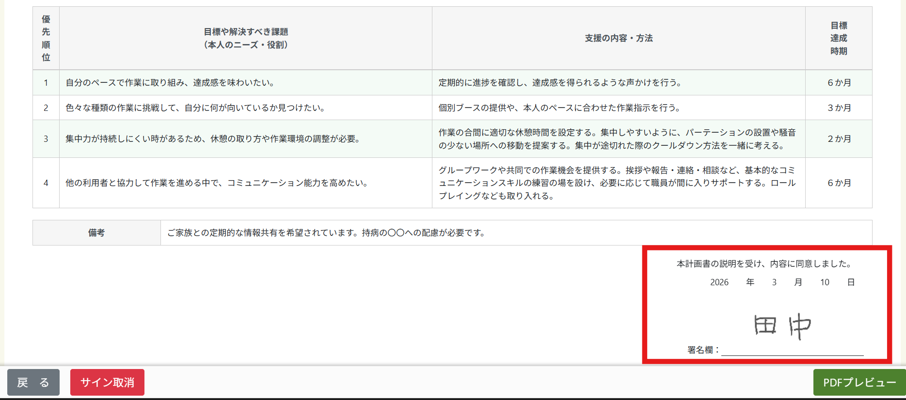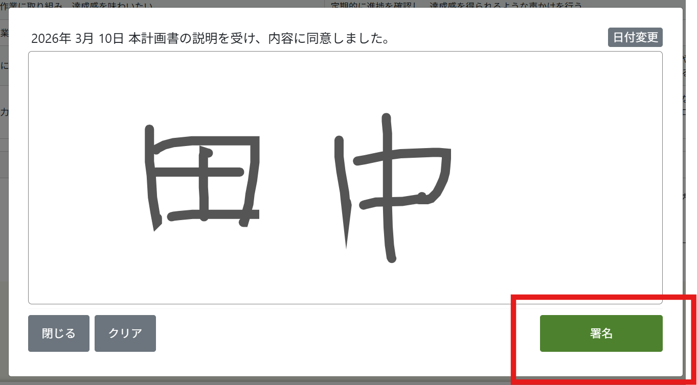 個別支援計画の署名欄にサインが反映されます。