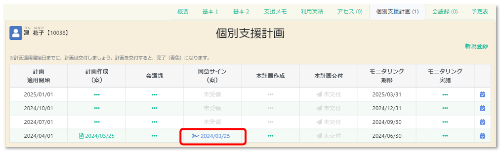 タブレット等で利用者にサインをもらった場合、個別支援計画のタブの一覧で、「同意サイン(案)」欄に自動で日付が反映されます。