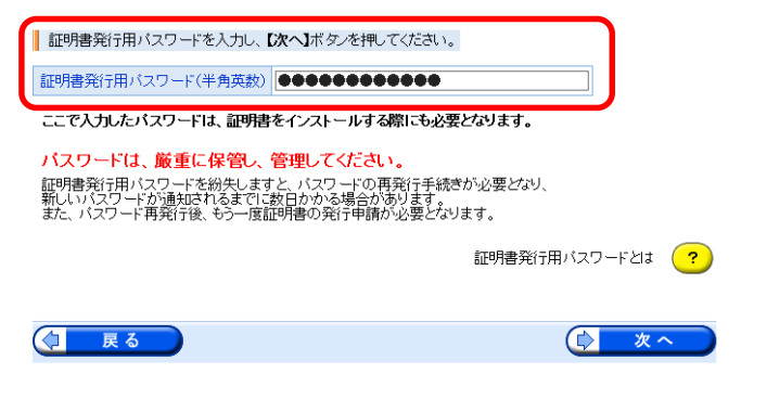 7.証明書発行用パスワードを入力し、次へボタンをクリックします