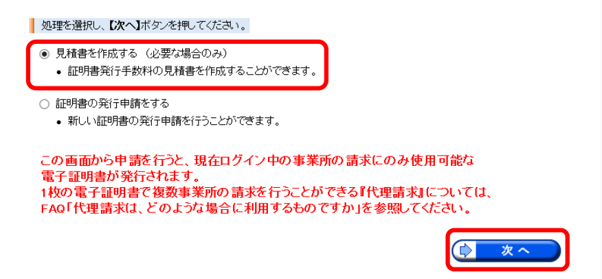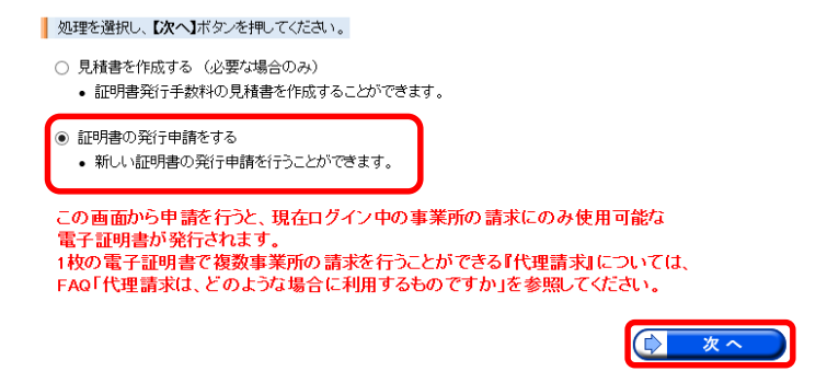 6.証明書の発行申請をするを選択し、次へをクリックします