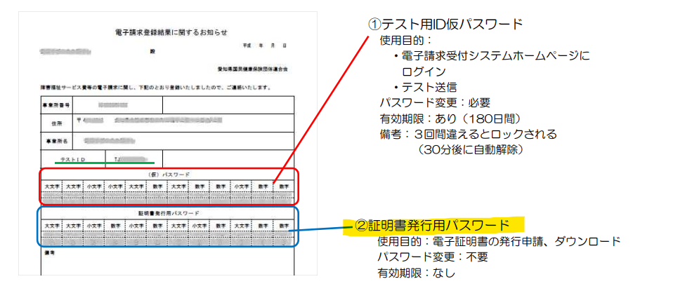 テストIDが表示されている電子請求登録結果に関するお知らせに証明書発行用のパスワードも記載されています。