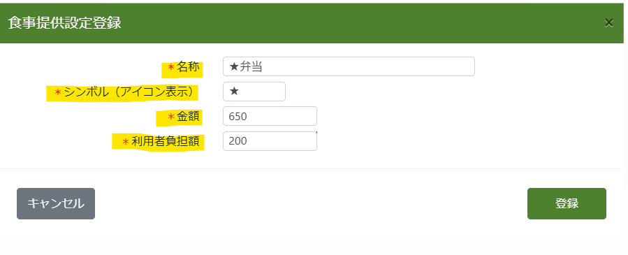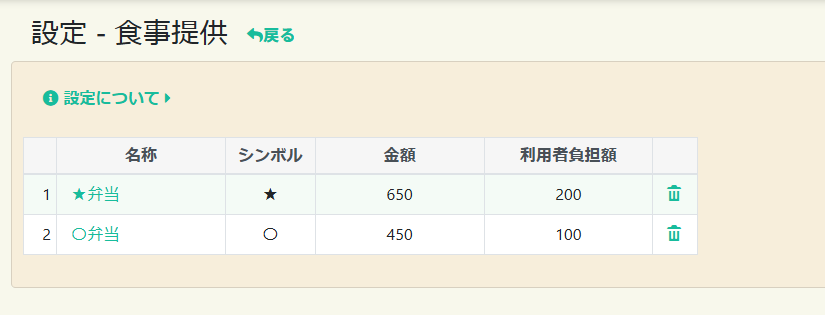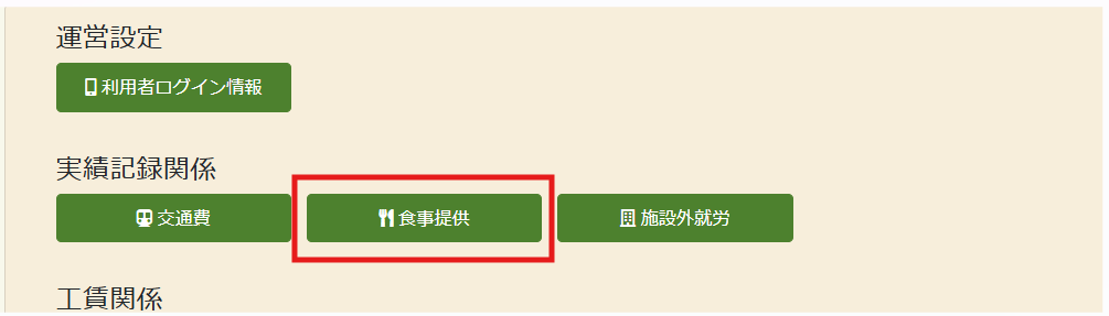 日別利用状況で食事提供記録を登録するためには、設定が必要です。