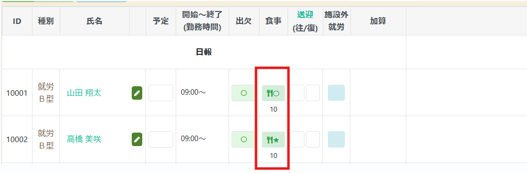 対象サービス:就労継続支援A型、就労継続支援B型、就労移行支援、自立訓練、生活介護 日別状況の食事提供加算欄で、食事の摂取量を記録できます。 食事提供加算をクリックした場合に 10(全量)が表示され、さらにクリックすると 10→7→4→1 と食事摂取量を変更できるようになります。 10:完食 7:7割摂取 4:4割摂取 1:1割摂取 関連するFAQ 食事提供体制加算の記録方法 食事提供記録の設定方法