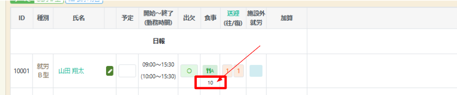 対象サービス:就労継続支援A型、就労継続支援B型、就労移行支援、自立訓練、生活介護 日別状況の食事提供加算欄で、食事の摂取量を記録できます。 食事提供加算をクリックした場合に 10(全量)が表示され、さらにクリックすると 10→7→4→1 と食事摂取量を変更できるようになります。 10:完食 7:7割摂取 4:4割摂取 1:1割摂取 関連するFAQ 食事提供体制加算の記録方法 食事提供記録の設定方法