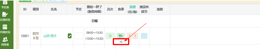 対象サービス:就労継続支援A型、就労継続支援B型、就労移行支援、自立訓練、生活介護 日別利用状況で食事提供体制加算を登録する方法をご説明します。 1. メインメニューの【日別状況】をクリックします 2. 食事欄をクリックします 3. アイコンの下にある数字をクリックし、利用者の食事摂取量を選択します 関連するFAQ 食事提供記録の設定方法 食事摂取量の記録方法